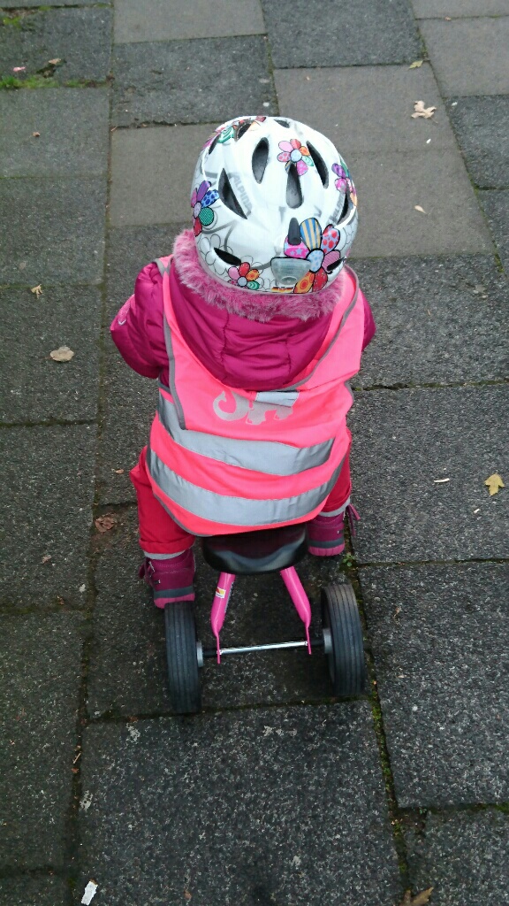 Für die Sicherheit hat meine Frau eine Warnweste gekauft . Einen Helm haben wir schon länger. Diesen trägt die kleine sehr gerne und sie beschwert sich immer wieder wenn wir ihn wieder ausziehen .