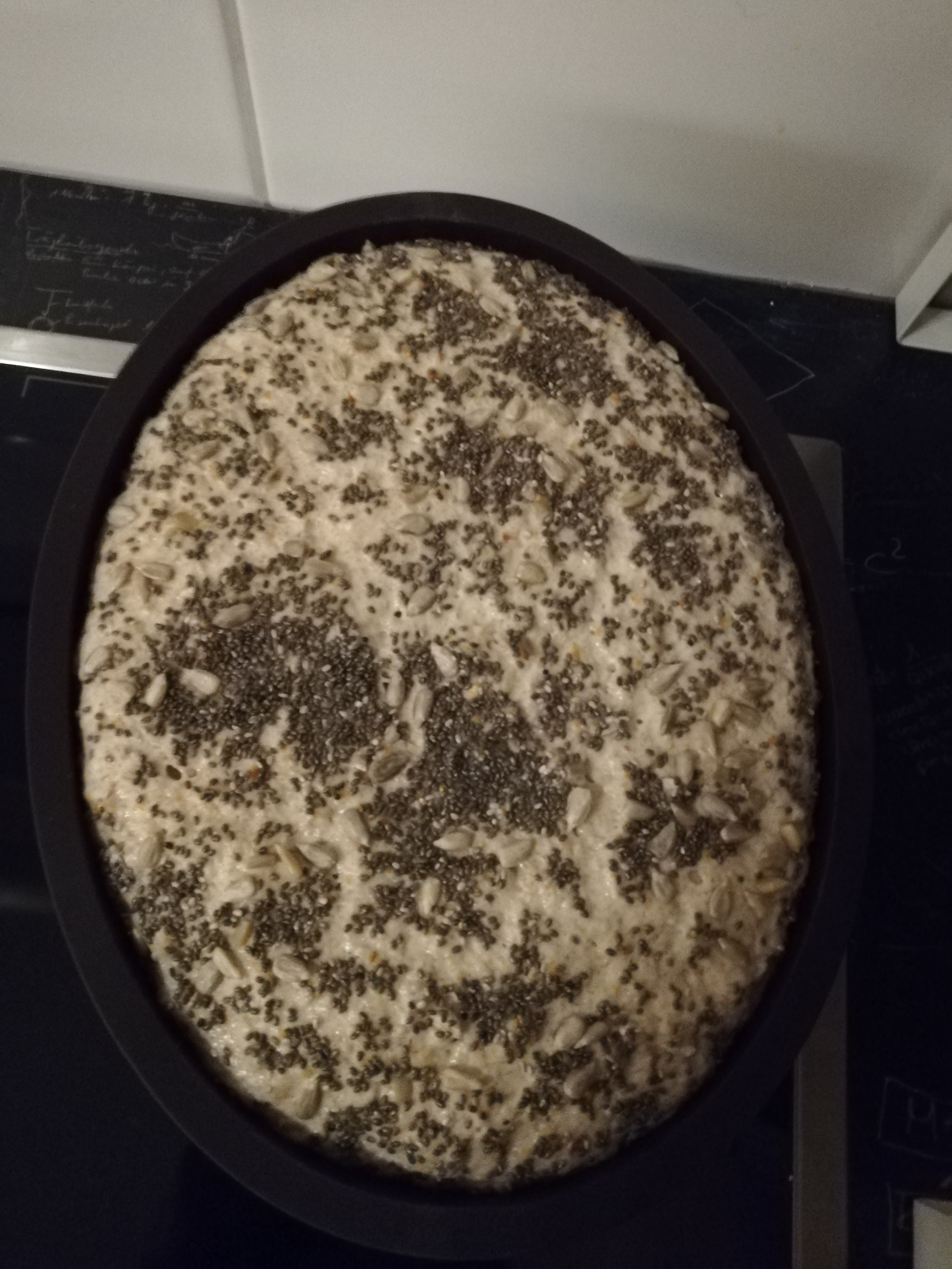 Heute hat sie ein Brot mit Chiasamen und Sonnenblumenkernen gemacht.