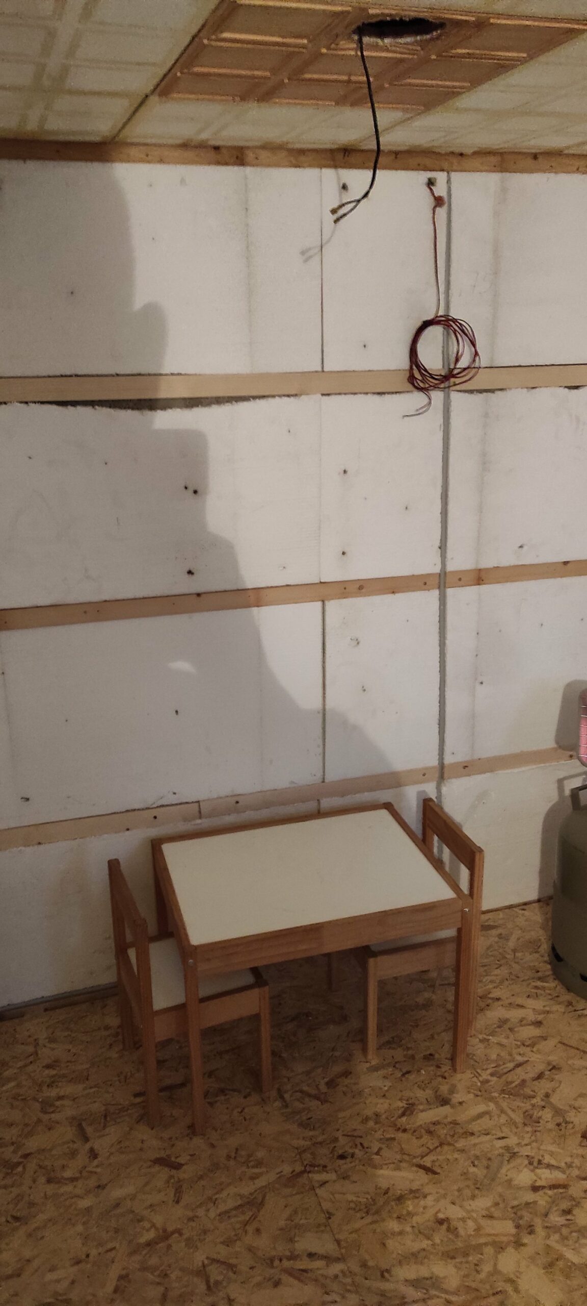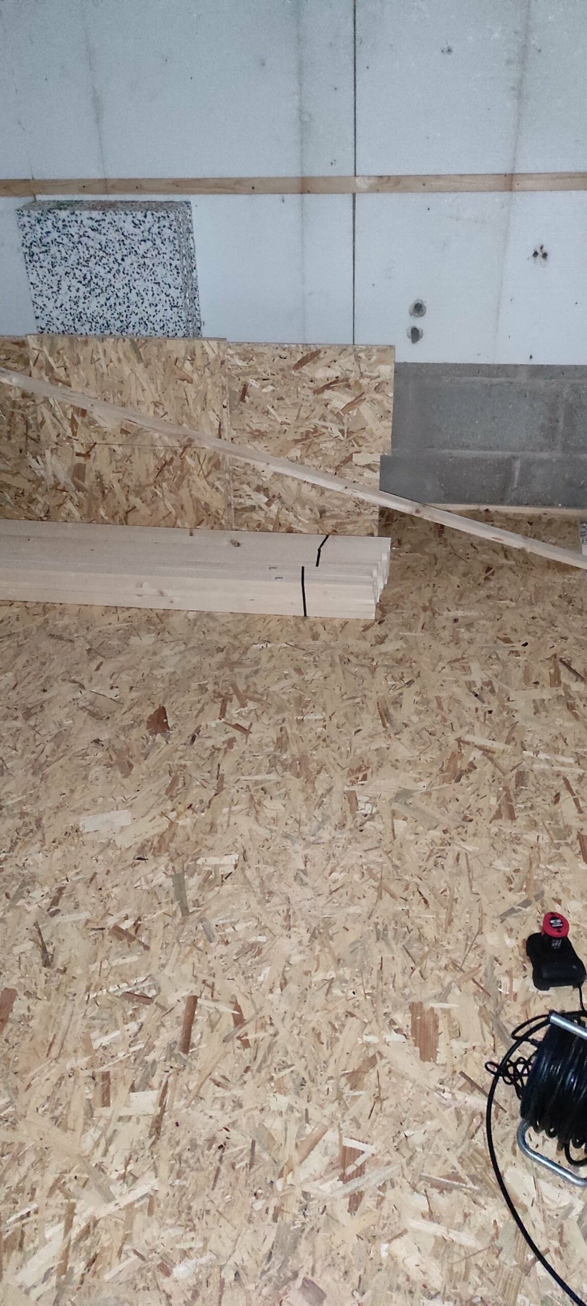 Ich weiß, ich hätte von oben nach unten arbeiten sollen. Ich möchte jedoch die Gipskartonplatten auf den fertigen Boden stellen. Die von mir verlegten OSB-Platten sind nicht so feuchtigkeitsempfindlich wie die Gipskartonplatten.