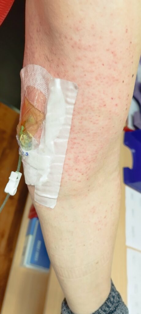 Ich sollte es beobachten und am Freitag wieder kommen wenn es nicht aufhört zu Jucken bzw. wenn es mehr wird. Es gab laut der Schwester vier mögliche Gründe für den Ausschlag.