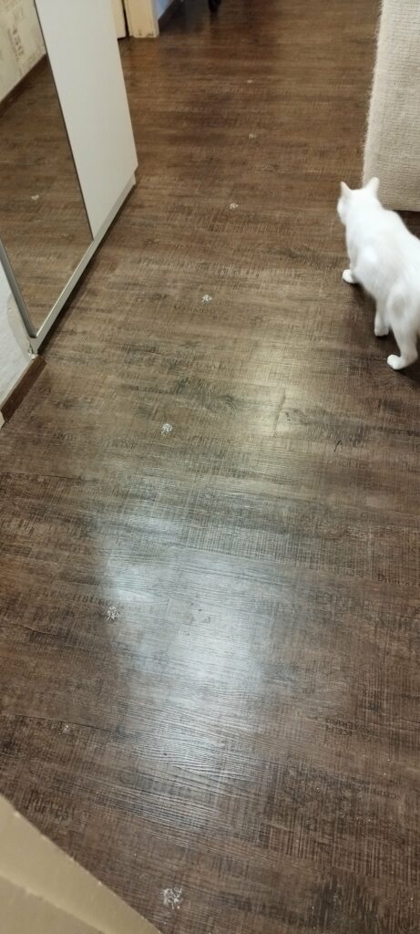 Er schreibt in seinem Brief, dass er die Umgebung unserer Wohnung erkundet hat. Anscheinend ist er irgendwo hinein getreten und hat im Flur eine weiße Spur hinterlassen.