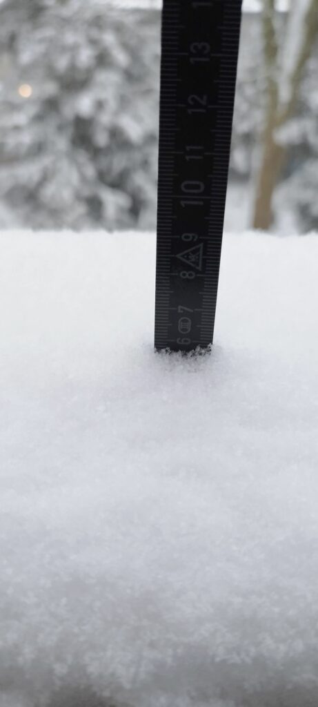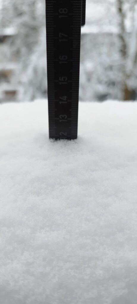 Über Nacht hat es noch weiter geschneit so dass wir heute morgen 12 Zentimeter Schnee auf der Brüstung liegen haben.