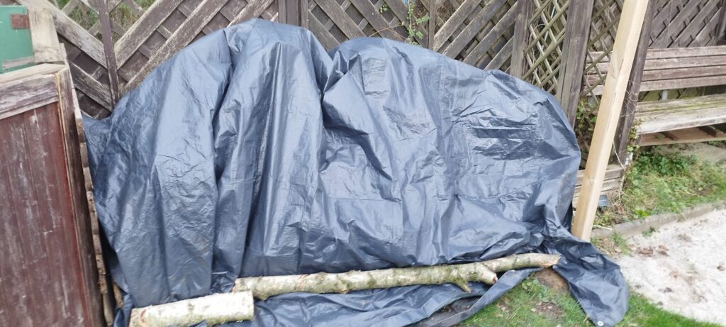 Es sieht viel aus, es ist aber eine überschaubare Menge. Im Garten habe ich es sauber augestapelt und erstmal mit einer Plane abgedeckt.