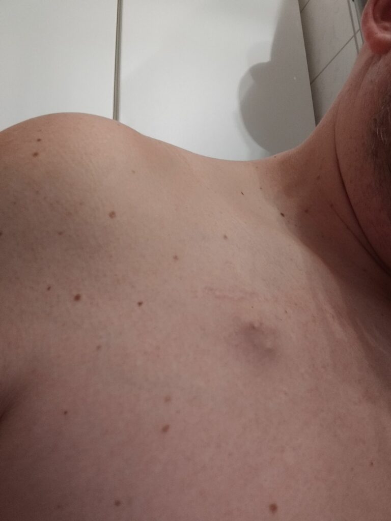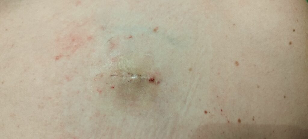 Das ist das was aktuell nach der OP zu sehen ist. Schmerzen habe ich keine mehr, es juckt nur ziemlich.