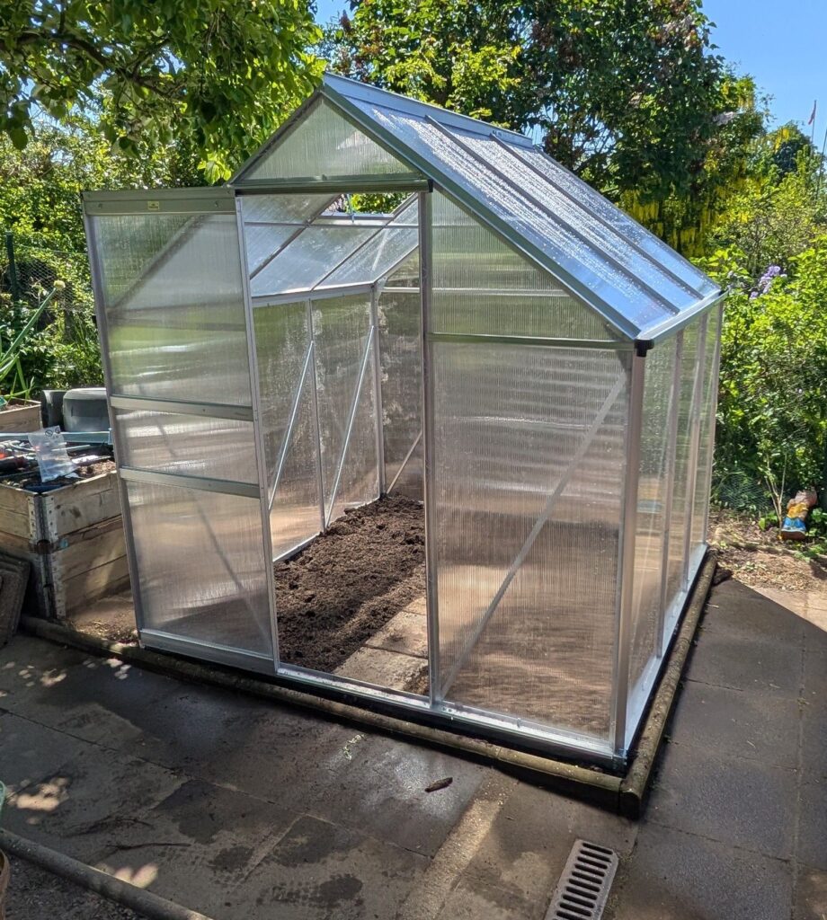 Eigentlich wollten wir ein Gewächshaus aus einem leerstehenden Garten übernehmen, jedoch stellte sich beim abbauen des Gewächshäuses heraus das zu viele Scheiben kaputt sind und ein neuerwerb der defekten Scheiben teurer würde wie ein neues zu kaufen.