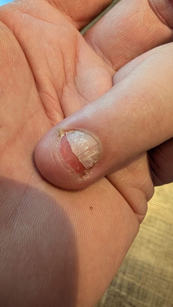 Heute morgen hat sich der Fingernagel an meinem linken Ringfinger zur Hälfte verabschiedet.