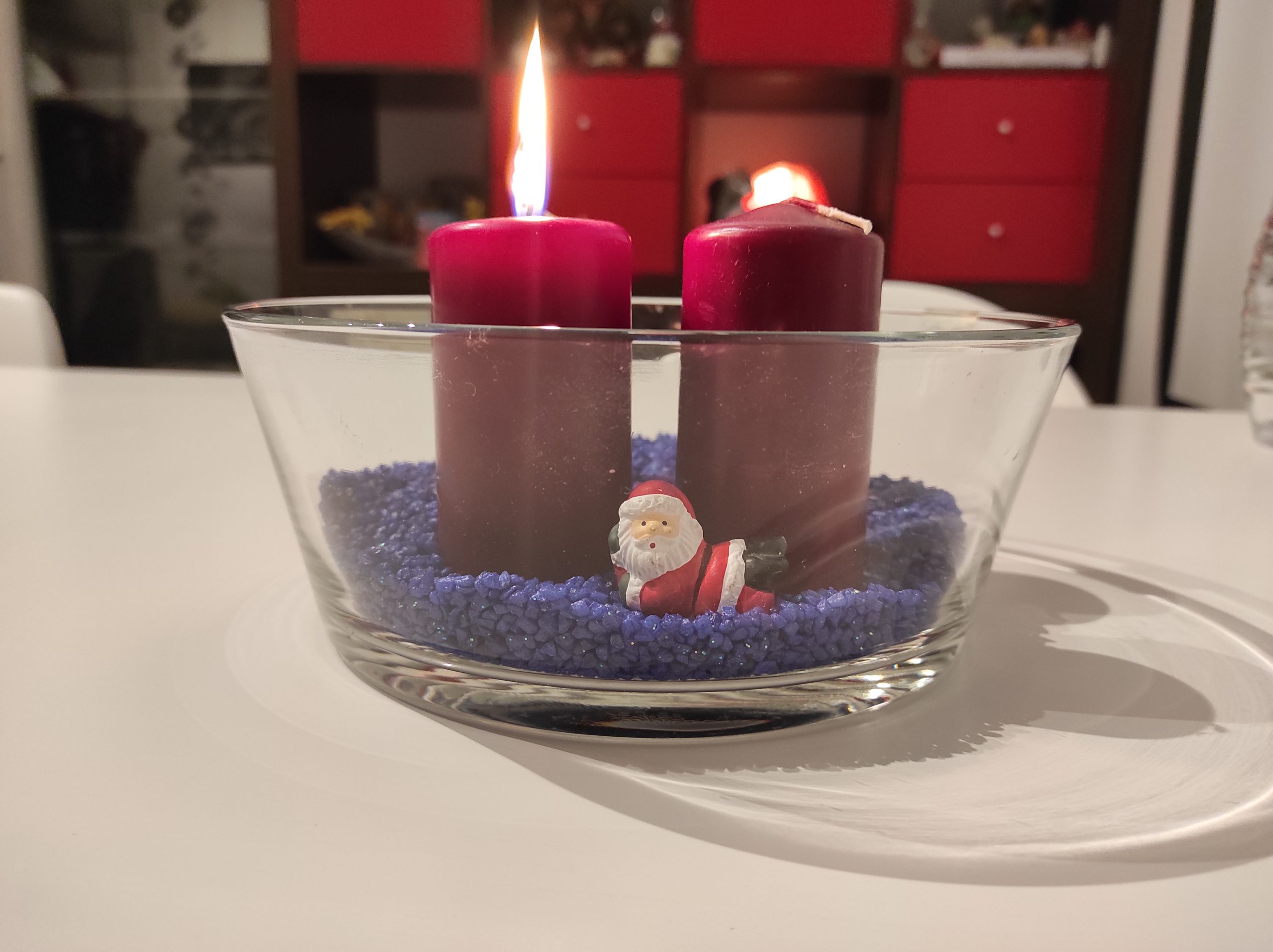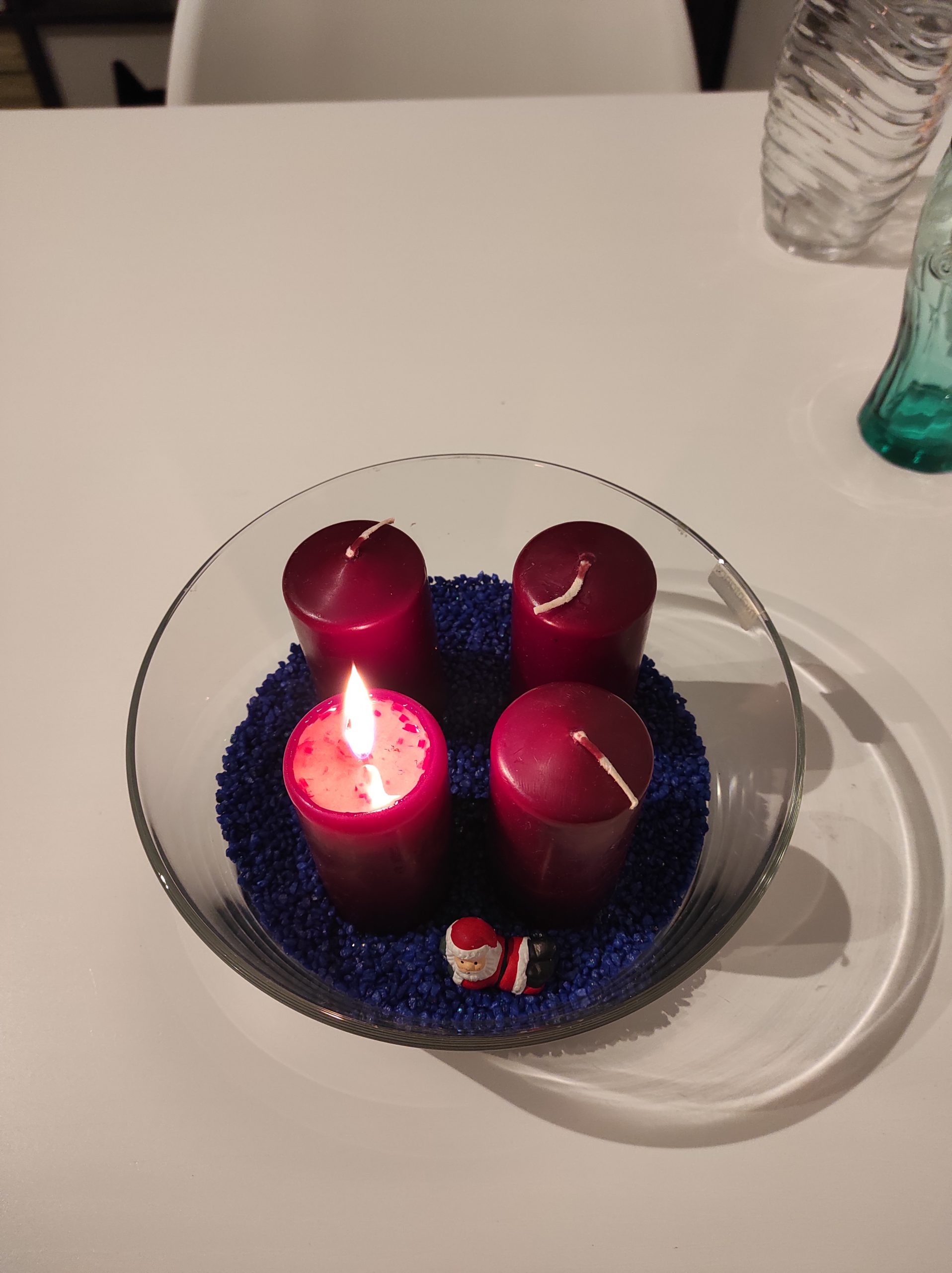 Adventsgesteck ist es nicht, Adventskranz auch nicht, ein vier Kerzen Dings Bums oder einfach eine Glasschale mit vier Kerzen und einem Nikolaus drin.