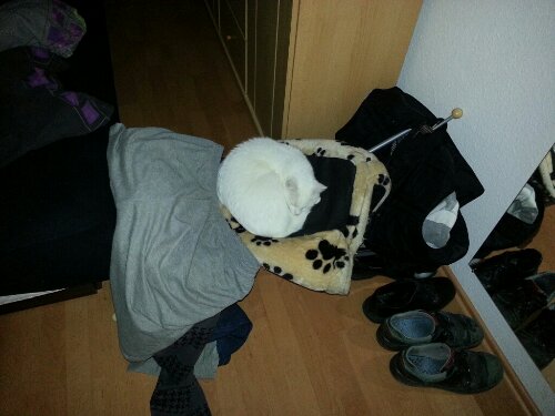 Als ich heute morgen wach wurde und ich meine Hose von meinem stummen Diener nehmen wollte musste ich erst einmal meine Katze umlagern.