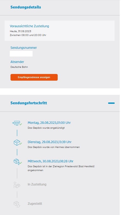 Ich habe heute morgen nochmals bei Hermes nachgefragt. Der Götterbote startet nun eine Recherche nach meinem Koffer.