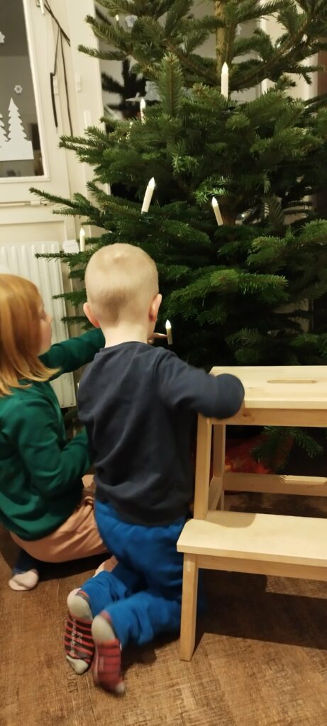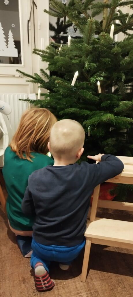 Erst wollten meine Kinder das die Engel den Baum schmücken, als er jedoch stand änderten die zwei ihre Meinung.