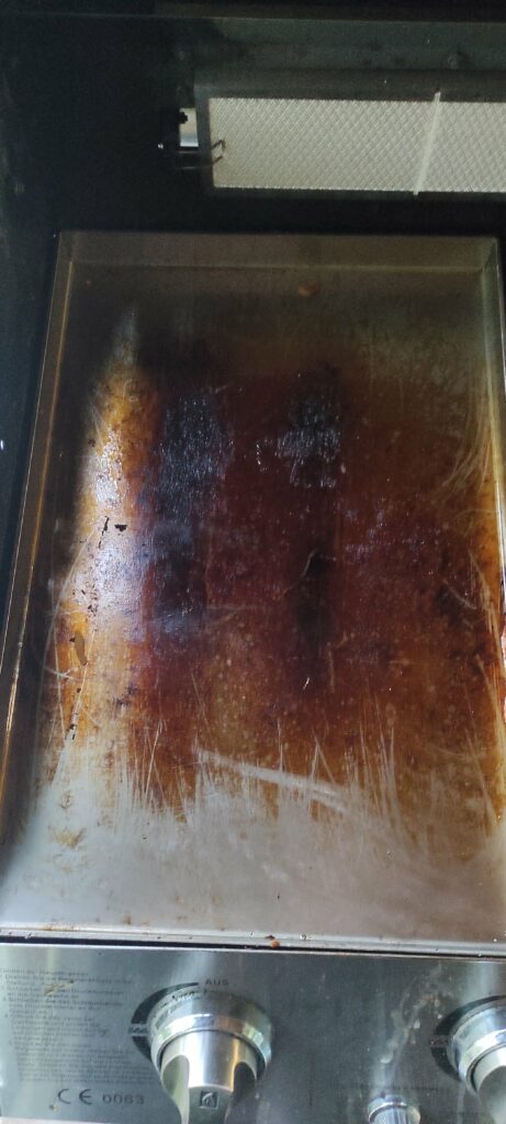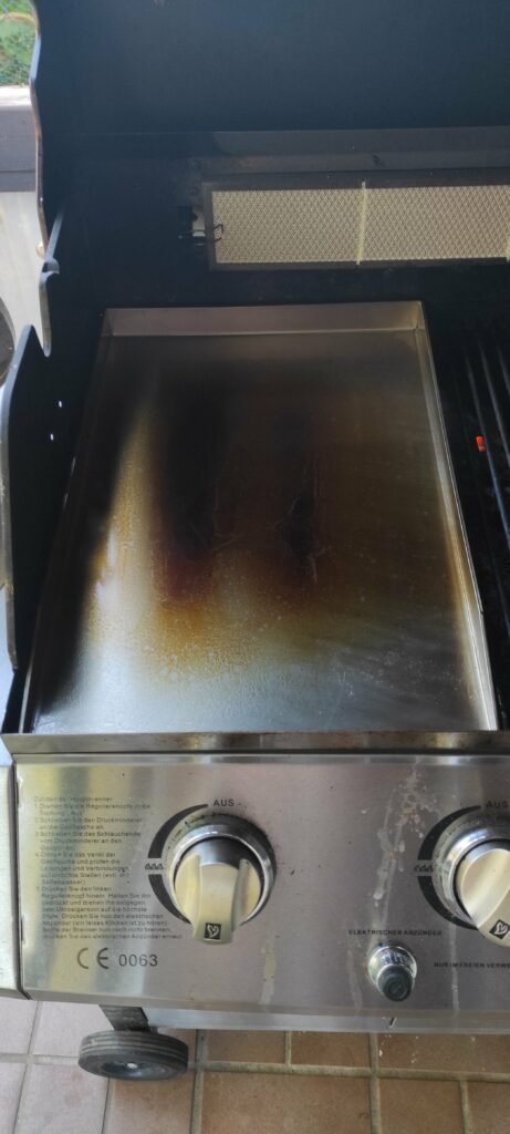 Auf dem Rost habe ich bisher immer mit einer Stahlpfanne improvisiert. Nun habe ich mir über Ebay-Kleinanzeigen eine auf Maß angefertigte Platte gekauft.