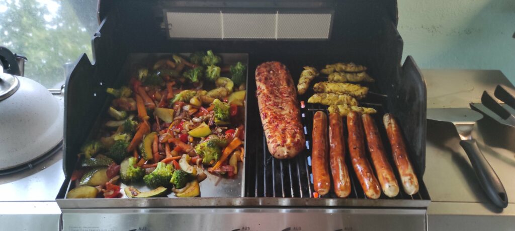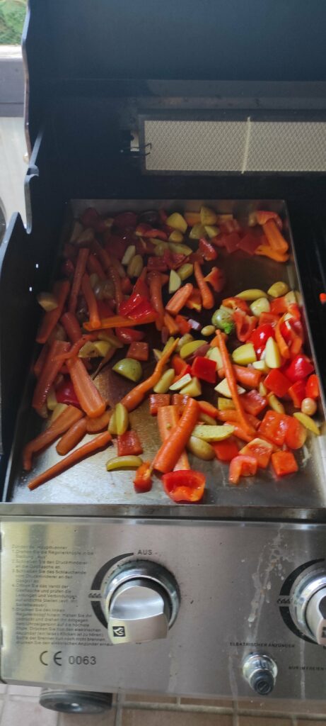 Am Freitag haben wir Grillgemüse von der Plancha mit Grillfleisch und Würstchen genossen.