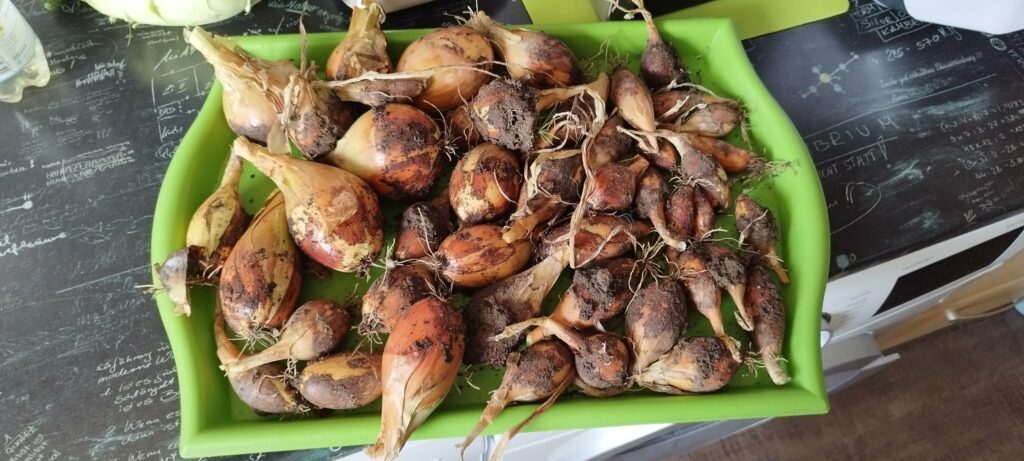 Zusätzlich haben wir eine Fläche (3×0,6 m) mit Kartoffeln und Mais bestückt. Im Unterstand sind noch Gurken und Paprika eingezogen. Zum Schutz vor Wühlmäusen und Pilzkrankheiten haben wir im Unterstand und da wo die Tomaten hin sollen noch jede Menge Zwiebeln gesteckt. Hat letztes Jahr gut geklappt, wird dieses Jahr bestimmt auch gut werden.