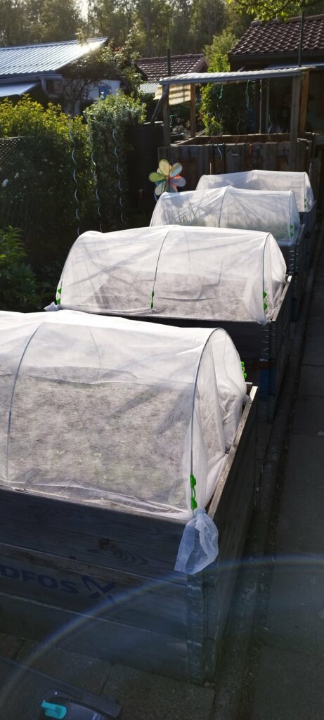 Das Fleece über den Hochbeeten hat meine Frau heute gegen Netze getauscht. Damit möchten wir unseren Kohl vor Schädlingen schützen.