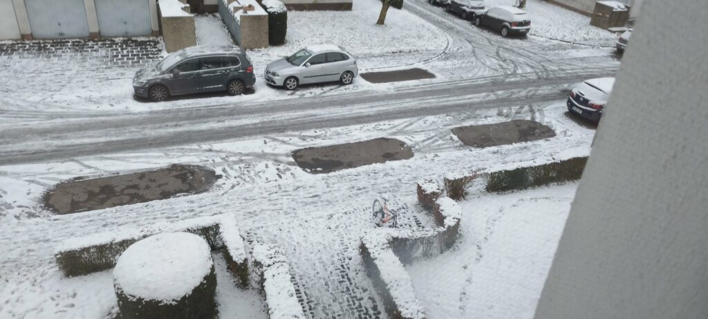 Dieses Jahr hat es bisher sage und schreibe einmal geschneit, alles wunderschön weiß. Das war es auch heute morgen um 9:10 Uhr noch immer.