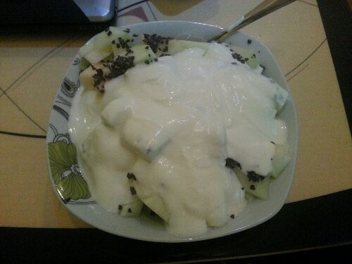 Heute gab es für mich eine sehr leckere Honigmelone mit Joghurt und ein paar Schokonuggets.