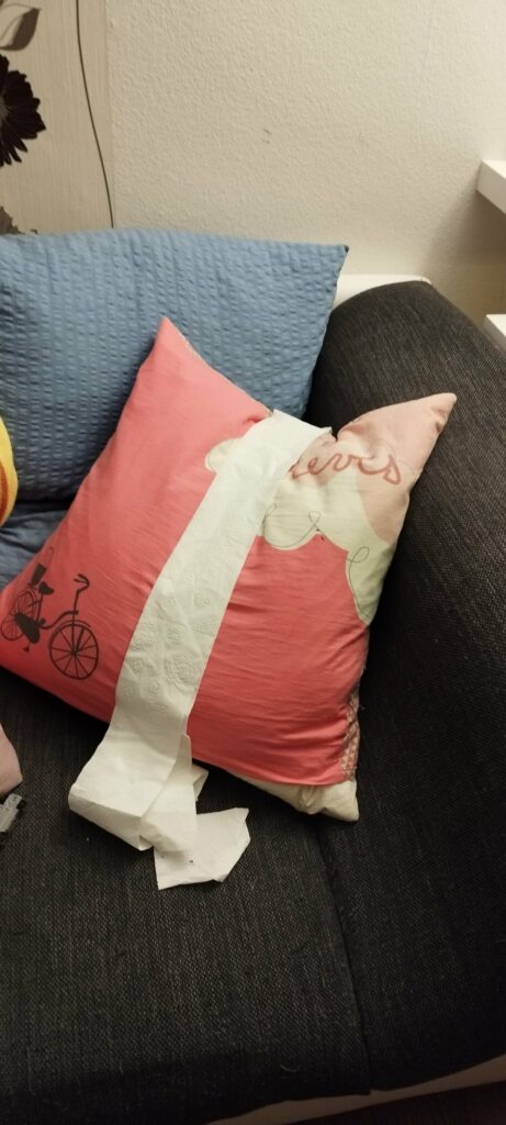 Die zweite haben sich mangels Schnee eine Rodelbahn aus Klopapier gebaut.