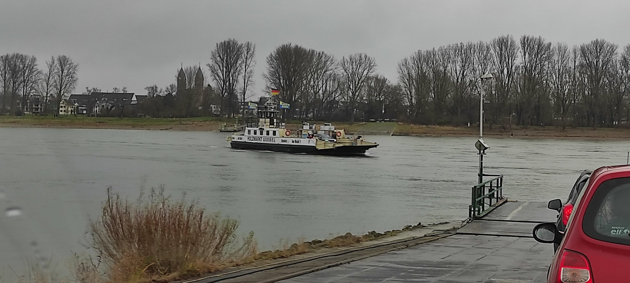 Nachdem ich im ersten Moment ohne wahres Ziel los gefahren bin, fiel mir ein das wir eine Fähre über den Rhein haben. Also fuhren wir dort hin und warteten darauf das die Fähre anlegt.