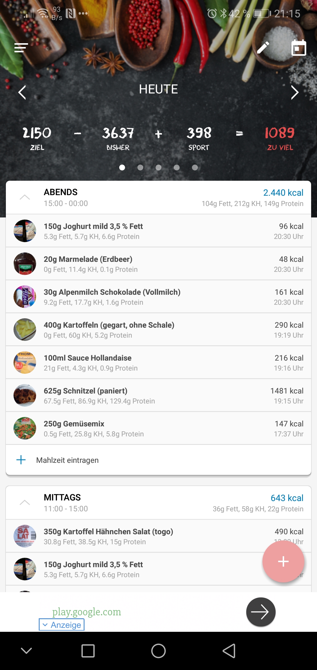 In der letzten Woche gab es drei Tage an denen ich mich absolut nicht Bremsen konnte. Das hatte zur Folge das ich an den drei Tagen mit mehr als 3500 kcal abgeschlossen habe. Am gestrigen Tag habe ich die Kalorienzahl verdoppelt.