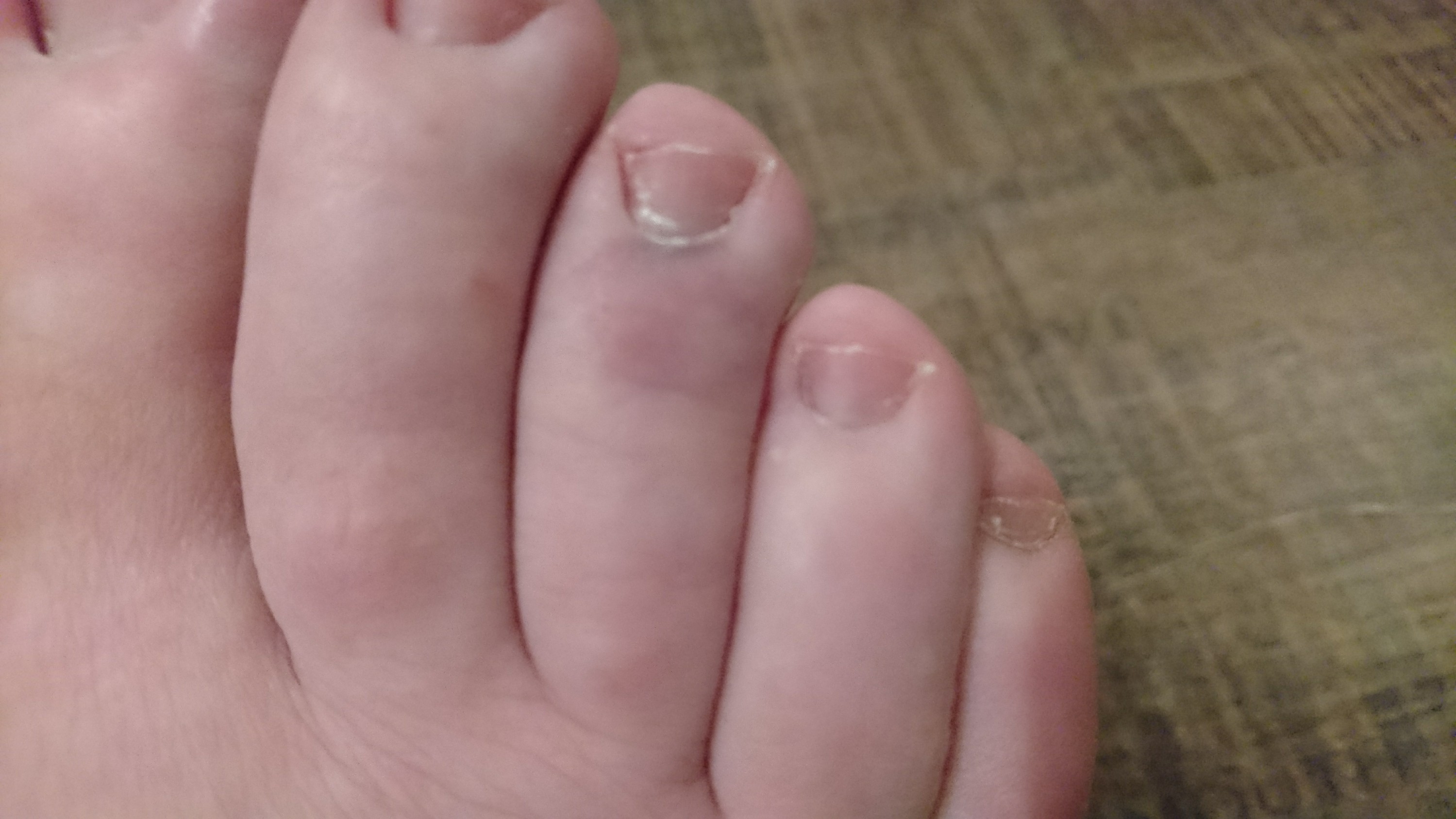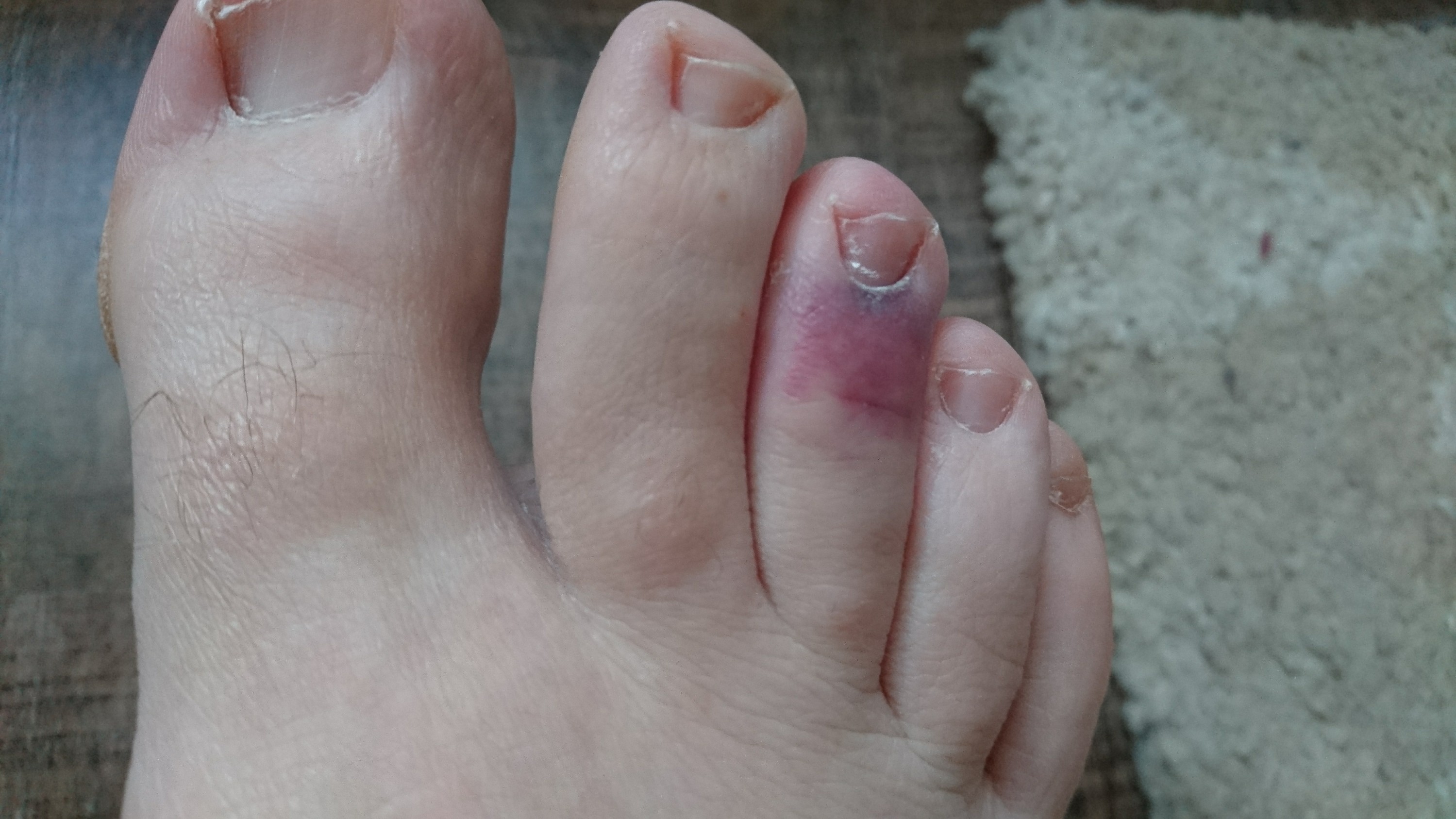 In unserem Renovierchaos ist mir gestern Abend ein kleines Missgeschick passiert. Ich habe mich beim Laufen mit dem Platz verschätzt und habe den Stuhl meiner Tochter mit dem Zeh mitgenommen.