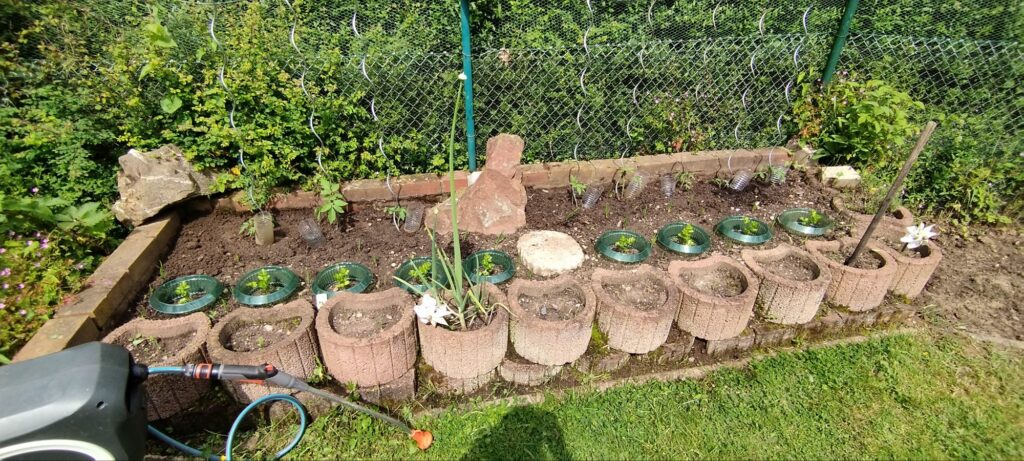 Den Sellerie haben wir dieses Jahr das erste Mal. In den Ringen ganz vorne vor haben wir Zwiebeln ausgesät. Eine der darin versenkten Zwiebeln haben Blüten angesetzt.